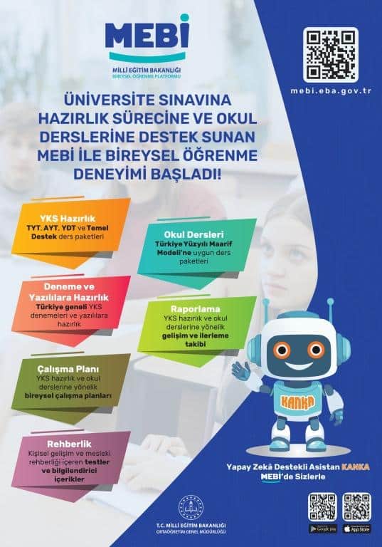 Bakanlığımız tarafından 21.10.2024 tarihinde tanıtılan yapay zekâ destekli "MEBİ" Bireysel Öğrenme Platformu, ortaöğretim kademesinde öğrenim gören ve mezun öğrencilere yönelik olarak geliştirilmiştir. Platform, "YKS Hazırlık", "Okul Dersleri", "Deneme/Yazılıya Hazırlık", "Çalışma Planı", "Raporlama" ve "Rehberlik" modülleri aracılığıyla öğrencilere kişiselleştirilmiş bir öğrenme deneyimi sunmaktadır.